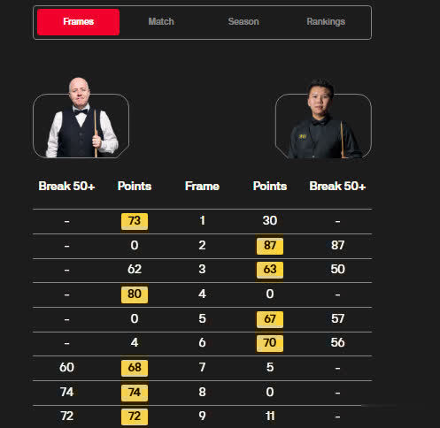 此后,两人展开拉锯战,胶着的比赛中,希金斯以73-30先胜一局,1-0领先。第二局,周跃龙在这一局开局率先上手得分,1-0、4-0、48-0,并以87-0扳平比分。